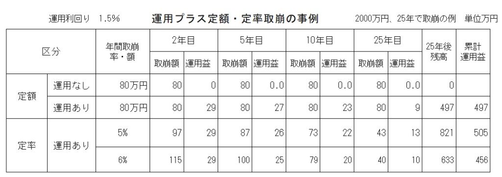 表は、定額取り崩しの運用益はゼロの場合と、定額と定率取り崩しで1.5%の運用益を複利とする場合の比較です。