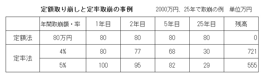 定額法は、毎年80万円取り崩しますが、25年後には残高は0円になります。